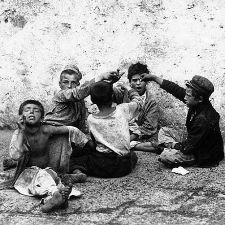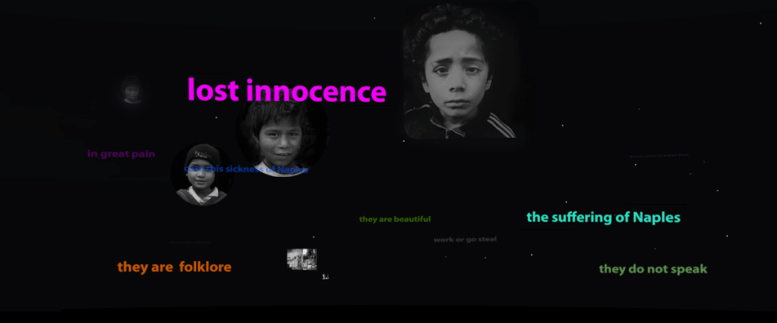 If we may overcome contemplation of appearance separated from its truth – the portrayal of a social situation and what gives rise to it when these photographic images are ‘perceived/read’, spectators taking their role as active interpreters, developing their own translation of these images and the ‘conditions‘ which give rise to them, the precariousness of their subjects, along with ‘authors’ text – it may then be possible that ruptures between sense and sense, between what is seen and what is thought, and between what is thought and what is felt, between passivity and action, may occur, when reading Carmen Auletta’s poetic response and looking to/engaging with… images of the Children of Naples…
